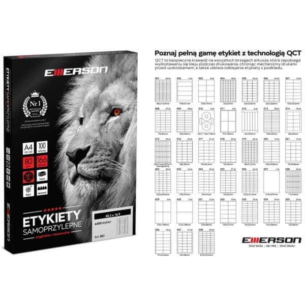 Etykiety znanej i cenionej marki EMERSON, wykonane z najwyższej jakości materiałów, trawłe i odporne, idealne rozwiązanie do biura jak i domu