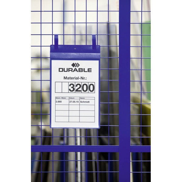 Kieszeń magazynowa posiadająca paski montażowe zakończone w kształcie strzałek, umożliwiające zaczepienie w otworach mocujących. Przeznaczona jest do informacji umieszczonych długoterminowo na pojemnikach do przechowywania czy skrzyniach do transportu. Dzięki swej wytrzymałości sprawdza się na ruchomych kontenerach transportowych, np. metalowych skrzynkach. Kieszenie nie wypadają podczas silnych wstrząsoacute;w. Niebieska tylna ścianka oraz przednia przezroczysta wykonane są z wytrzymałego polipropylenu. Możliwość stosowania roacute;wnież na zewnątrz ze względu na klapkę zabezpieczająca dokument przed deszczem i wilgocią. Pełna przezroczystość i możliwość skanowania. Szybka wymiana dokumentoacute;w. Wzory do zadrukowania wkładoacute;w dostępne na www.duraprint.eu.