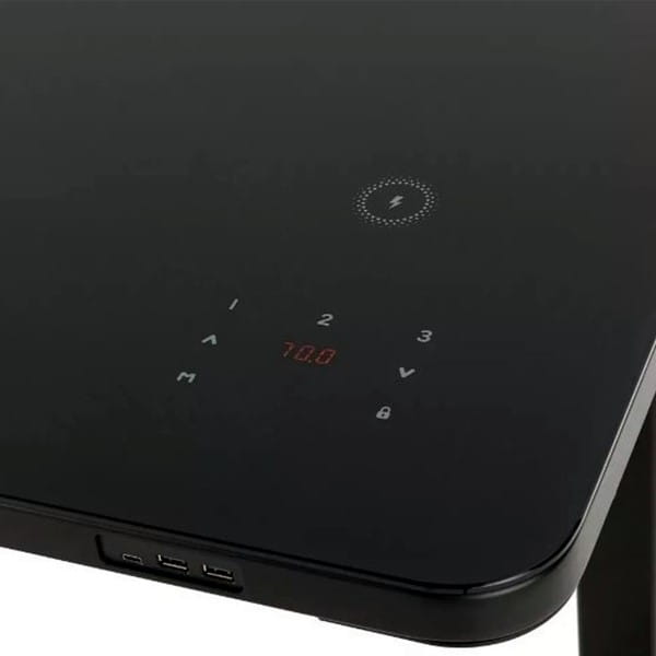 - Wygodny i intuicyjny panel dotykowy wbudowany w szklany czarny blat pozwoli Ci dostosować wysokość biurka do Twojego wzrostu oraz szybko i łatwo zmieniać pozycje pracy. A dodatkowo wygląda obłędnie i nowocześnie. Możesz wybrać swoje 3 ulubione wysokości pulpitu i zapisać je w pamięci panelu