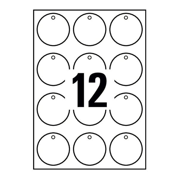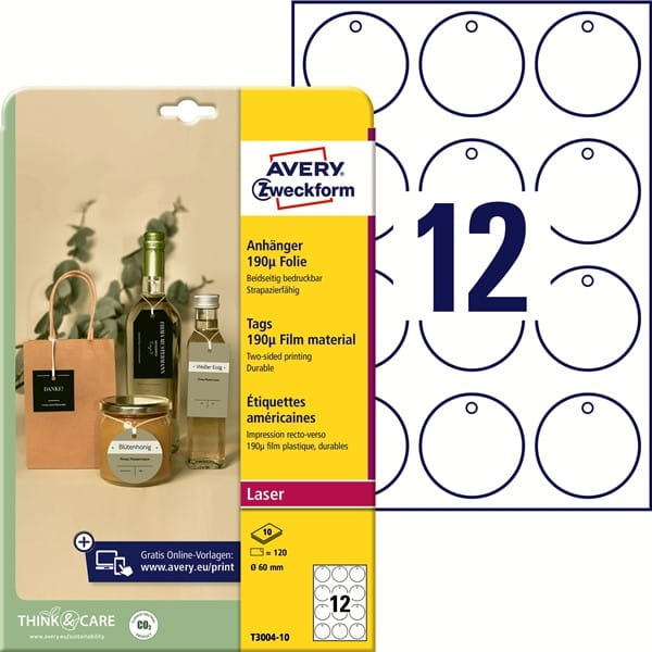 Etykiety/zawieszki foliowe 60mm okrągłe białe 190µ AVERY ZWECKFORM 10 arkuszy 120 etykiet /T3004-10/