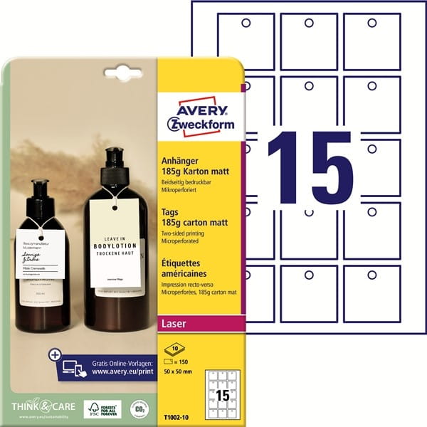 Etykiety/zawieszki kartonowe 50x50 białe 185g AVERY ZWECKFORM mikroperforowane 10 ARKUSZY 150 etykiet /T1002-10/