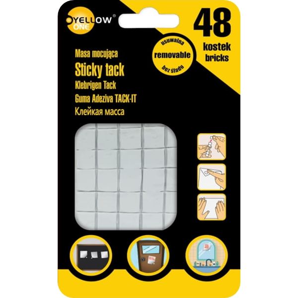 – samoprzylepna masa mocująca – umożliwia wielokrotne łączenie lekkich przedmiotów z większością powierzchni – do przyklejania zdjęć, plakatów, karteczek – zastępuje taśmę, pinezki – po odklejeniu nie pozostawia śladów na gładkich powierzchniach – opakowanie zawiera 50 g masy podzielonej na 48 kostek